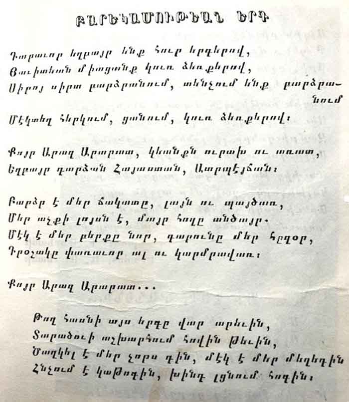 Երգը քաղած եմ նախակրթարանի աշակերտութեան օրերու երգարանէս): Անիկա կը ձայնասփռուէր, կը հնչէր «հայրենասէրներու» տուներուն մէջ… Իսկ թէ նման «բանաստեղծութիւն» գեղարուեստական ի՞նչ արժէք ունի, արդեօք խնդուք պատճառող բառակոյտէ աւելի բա՞ն մըն է` արդէն ուրիշ հարց է: