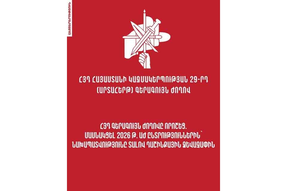 ՀՅԴ Հայաստանի կազմակերպութեան 29-րդ (արտահերթ) Գերագոյն ժողովը, քննելով Հայաստանի Հանրապետութեան Ազգային ժողովի 2026 թուականի ընտրութիւններին ՀՅԴ-ի մասնակցութեան ձեւաչափի հարցը, հիմք ընդունելով մարզային եւ քաղաքային ժողովների առաջարկութիւնները, ինչպէս նաեւ ժողովի մասնակիցների տեսակէտներն ու կարծիքները, արձանագրեց.