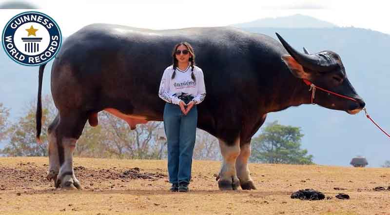– Աշխարհի ամէնէն մեծ կենդանի ջուրի գոմէշը, որ կ՛ապրի Թայլանտի մէջ. անոր մեծութիւնը կը հասնի 1 մեթր եւ 85 սմ: