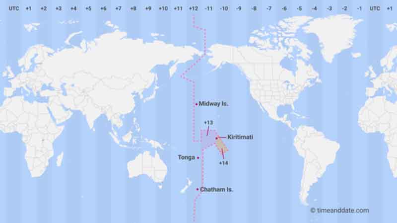 Այս պատճառով է, որ, ինչպէս մենք տեսանք անցեալ շաբթուան սիւնակին մէջ, Քիրիպասի Լայն (գիծ) կղզիները քարտէսին վրայ ամէնէն աջ կողմը` Խաղաղական ովկիանոսին մէջ գտնուող այս շրջանը առաջինը ընդունեց Նոր տարին: Հոն ժամը UTC+14 է: