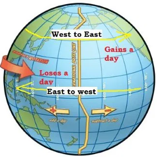 Այս սահմանին միւս ծայրի ամէնէն վերջին ժամային գօտին, որ կ՛արձանագրէ UTC-12 ժամ, կը նշէ նաեւ «թուականի փոփոխութեան գիծը»: Այս ձեւով, այս տարի, Նոր տարին ընդունող վերջին բնակիչները եղան Խաղաղական ովկիանոսի մէջ Սամօա եւ Նիու կղզիները: Իսկ երկրագունդին ժամերով ամէնէն հեռու գտնուող, սակայն աշխարհագրական գետնի վրայ իրարու «դրացի» այս երկու վայրերուն` Քիրիպաս եւ Սամօա ու Նիւ կղզիներուն միջեւ ժամի տարբերութիւնը 25 ժամ է: