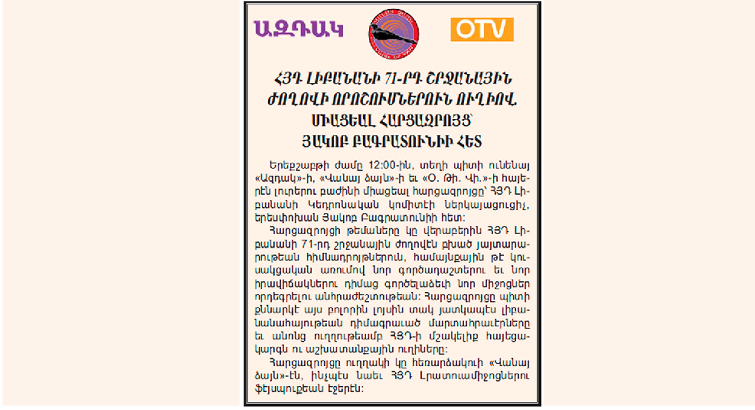 Լիբանանի պասքեթպոլի աղջկանց Ա. դասակարգի ախոյեանութեան կիսաւարտական հանգրուանի (ֆայնըլ-ֆոր) մրցումներուն ծիրին մէջ, վաղը` կիրակի, 3 մարտին, երեկոյեան ժամը 20:00-ին, «Աղբալեան-ՀՄԸՄ» ...